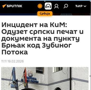 Portali Sputnik Srbija ka publikuar më 19 shkurt një artikull me titullin: “Incident në KiM: U sekuestruan vula dhe dokumente serbe në pikën e Bërnjakut pranë Zubin Potokut”.