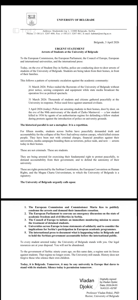 Universiteti i Beogradit i është drejtuar me një apel urgjent institucioneve evropiane, duke shprehur shqetësim për arrestimet e fundit të studentëve në Beograd, të cilat i cilëson si pjesë të një presioni në rritje ndaj komunitetit akademik dhe një përpjekje për të shtypur protestat studentore.