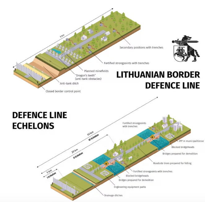 In an illustration shared by the MoD, the Lithuanian border defense line is shown to measure 50 kilometers-long.