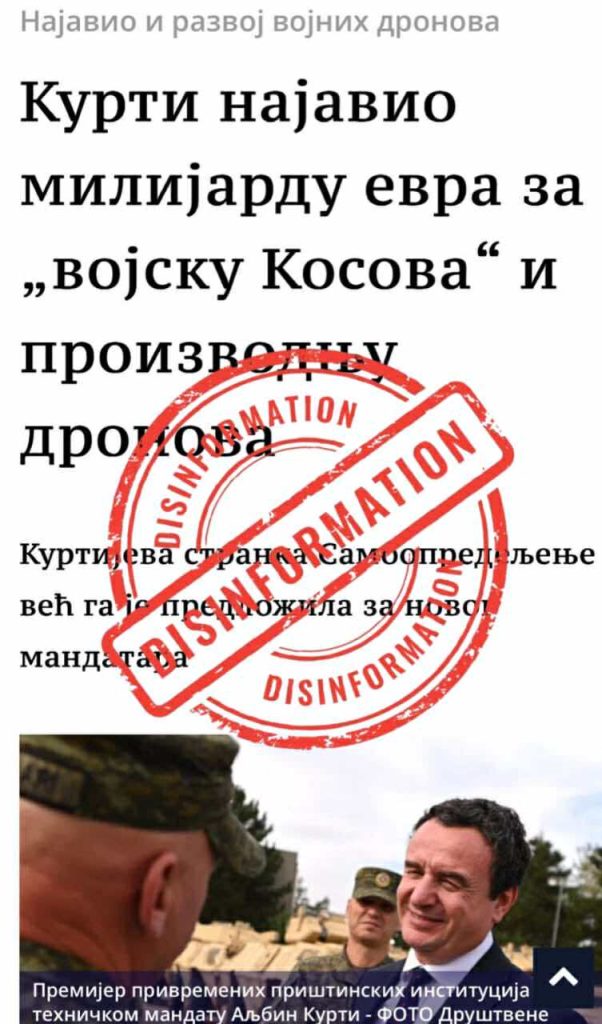 Mediat në Sërbi kanë shpërndarë së fundmi një valë dezinformatsh që i japin një interpretim të gabuar dhe të deformuar deklaratave të kryeministrit të Kosovës, Albin Kurti, duke paraqitur çdo veprim të shtetit të Kosovës si kërcënim të drejtpërdrejtë për Serbinë. Përmes titujve të tillë si “Përgatitet sulm i përgjithshëm ndaj Serbisë” dhe “Kurti paralajmëron gjakderdhje”, këto media synojnë të krijojnë një atmosferë frike dhe paniku, duke shpërndarë dezinformata rreth Kosovës .
