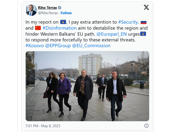 “Në raportin tim për Kosovën, i kushtoj vëmendje të veçantë sigurisë. Dezinformimi nga Rusia dhe Kina ka për synim të destabilizojnë rajonin dhe të pengojnë rrugën e Ballkanit Perëndimor drejt BE-së. Parlamenti Evropian nxit Kosovën të reagojë më fuqishëm ndaj këtyre kërcënimeve të jashtme”, shkruan ai.